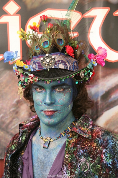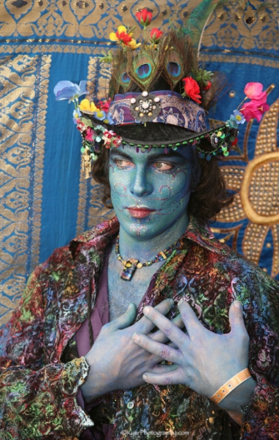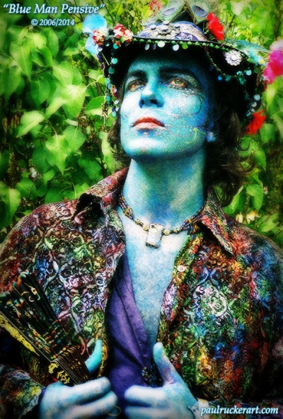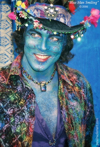 I decided to paint myself blue because that seemed the most otherworldly color for skin; the faerie artist Brian Froud commented to me that the Blue Man in faery lore was among other things, a psychopomp– a guide of souls to the Otherworld. (I believe the dangling skeleton on my hat brought this to his mind.)