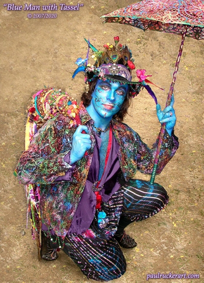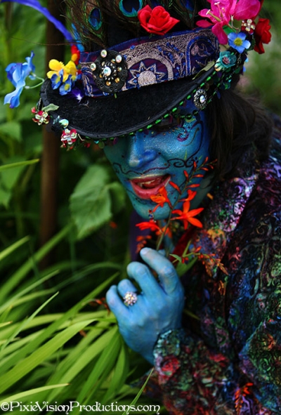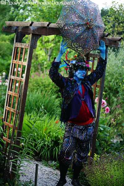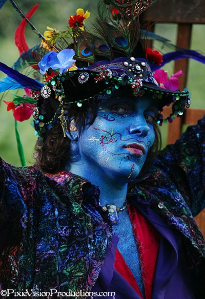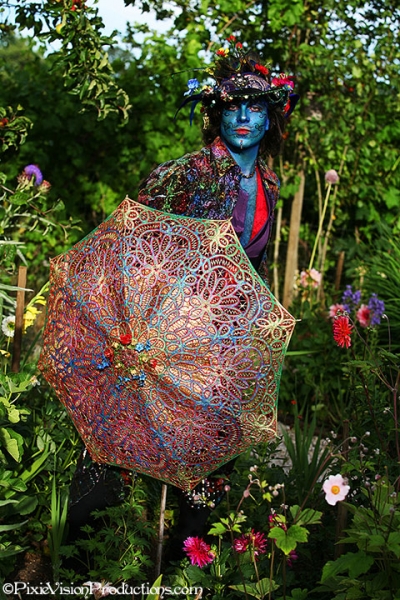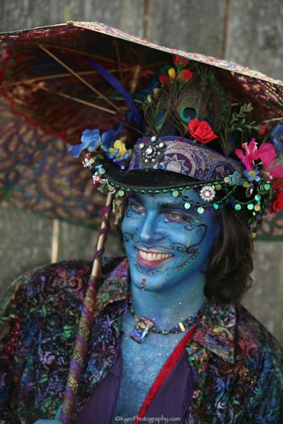 Every year that I have staged this character, I have been photographed by at least one of the pro photographers working for the show, and have seen images of myself used later in promotional material for Faerieworlds. In 2007 I was photographed by Pixie in a secret garden, and also by Kyer Wiltshire while on the main grounds. When I came back to live in Minneapolis in July 2008, I discovered that Kyer’s image of me (second from last, smiling with parasol) had been used to accompany the description of Faerieworlds in a feature on “Unconventions” (unusual festivals) in MAXIM magazine. (In 2009, Kyer included one of his head shots of me in a lush monograph of his festival photography called TRIBAL REVIVAL.)