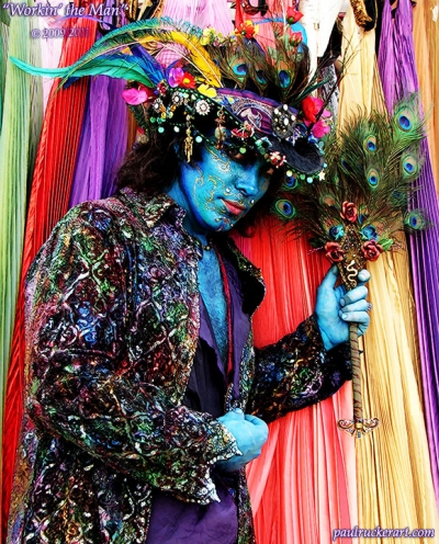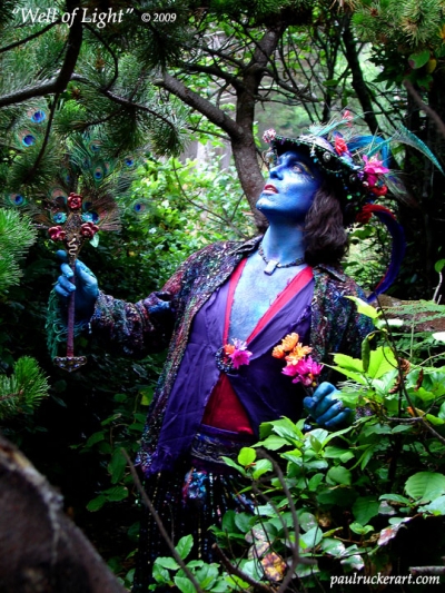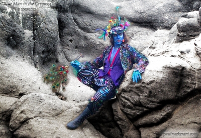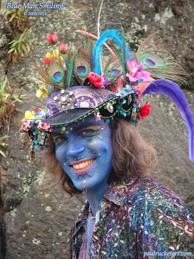 I came back to Oregon from Minneapolis one more time (to date) to present my Blue Man character again. By this time, Faerieworlds had moved to the Eugene, OR area and was being held in August. The temperatures were breaking through the mid-100s, so I only did the character for one day. After the three hours or so that it takes to do the face and hand painting, my friend with whom I was attending and I left for the festival around 4 p.m. It was curiously depopulated because of the heat, and I myself only lasted 4 hours until I had to take the makeup and outfit off.