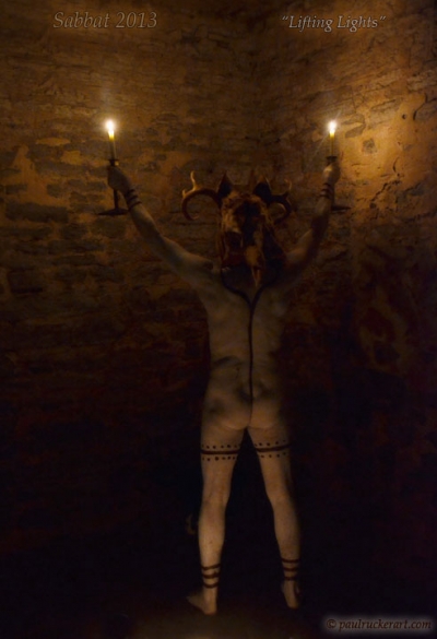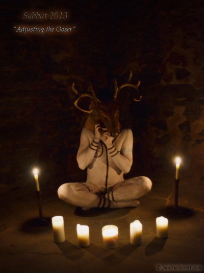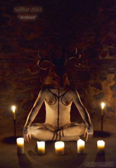 Preparation for a midwestern Witches’ Sabbat: I was asked to create the ritual designs on the body of the priest representing the Horned God at this event. The headdress he is wearing, called an “ooser” (pronounced “osser”) is part of the regalia of this office. Indoors he seemed to be a manifestation of caverns like those of Lascaux or Altamira, outdoors he seemed an avatar from a time known more to lore than history.
